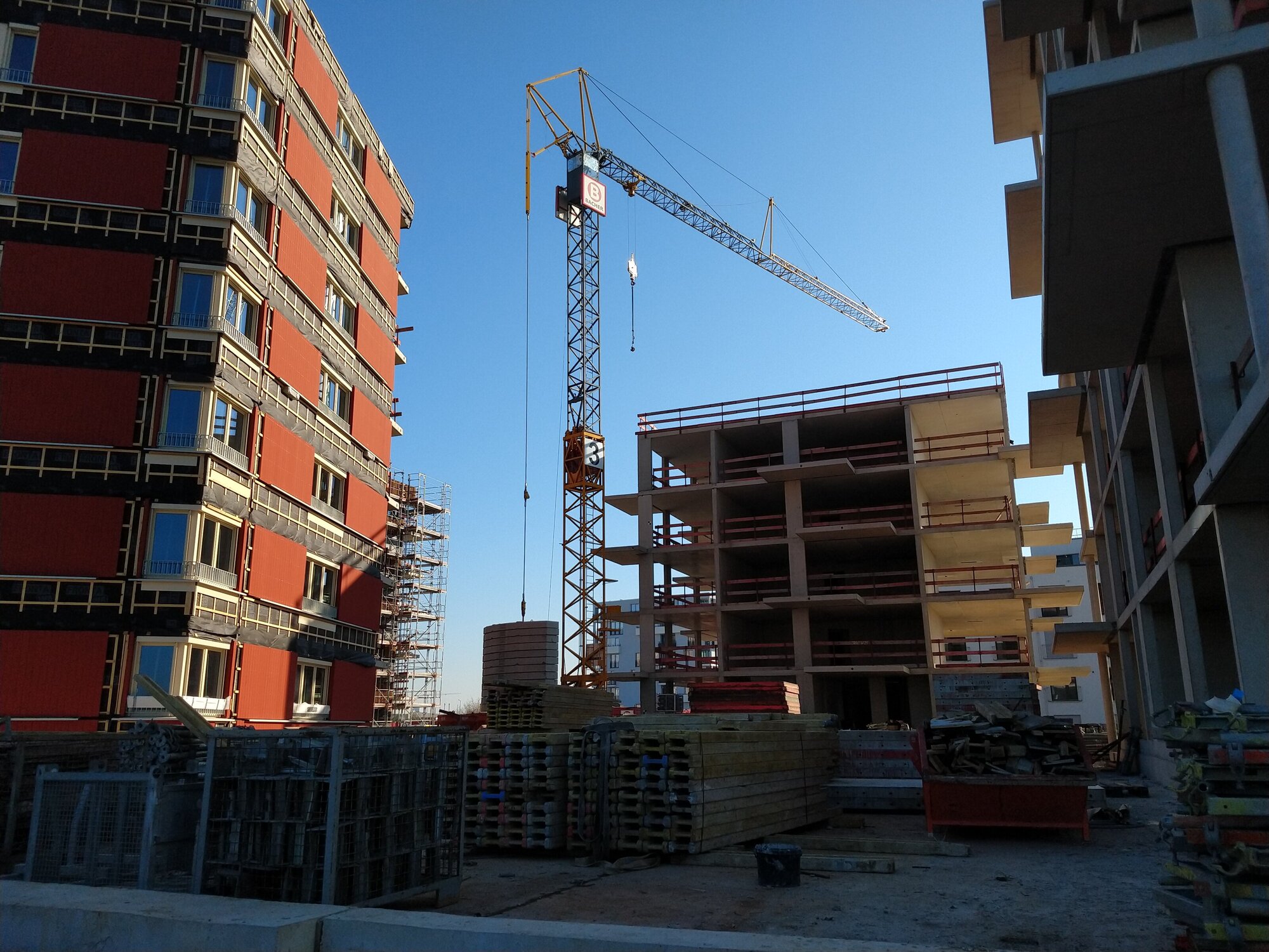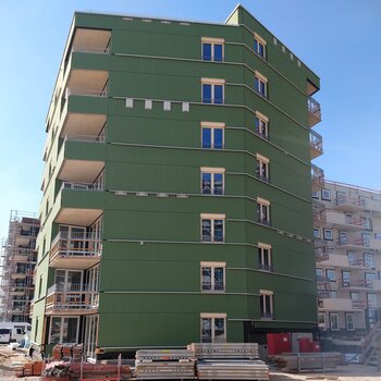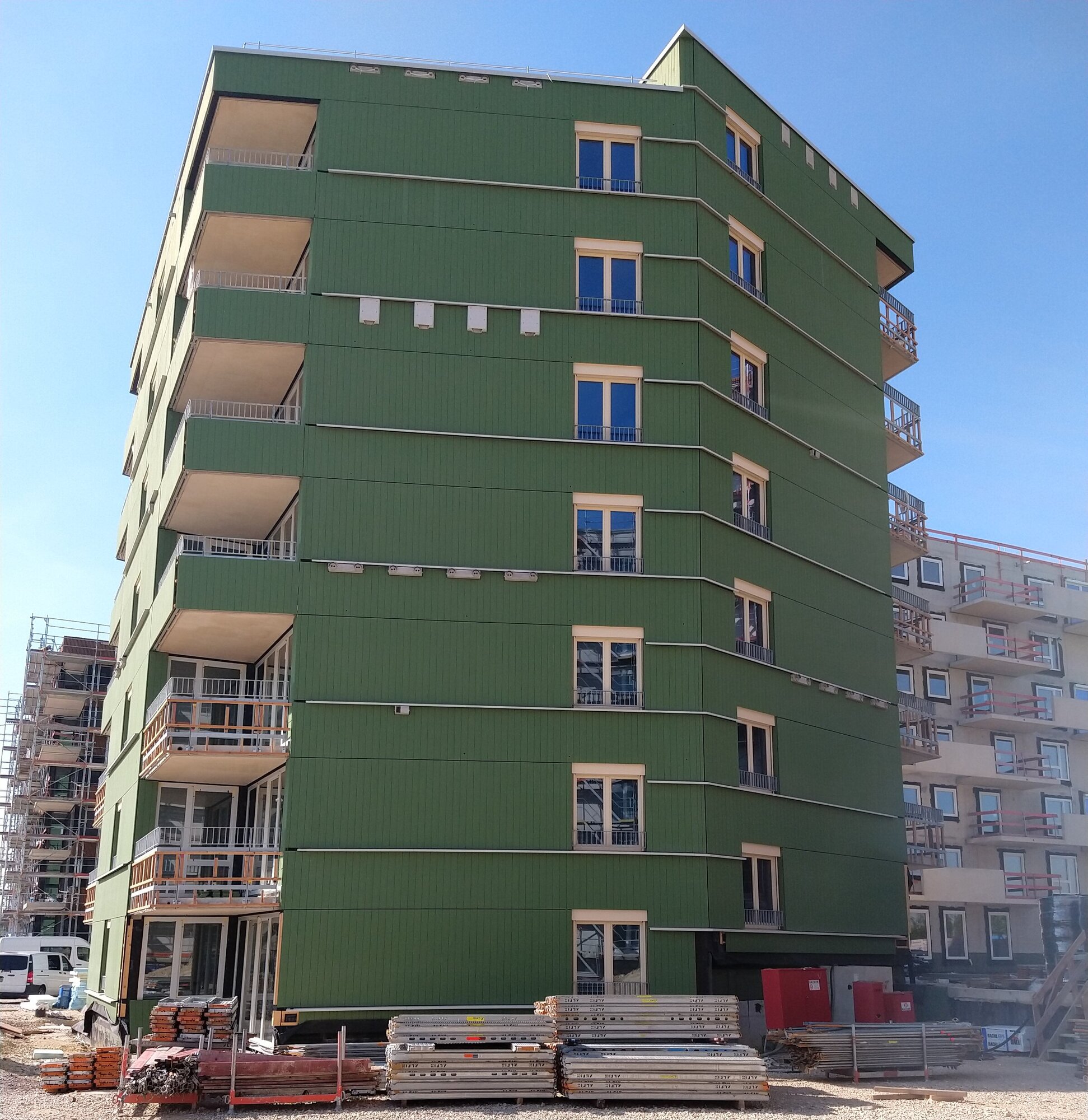 Das sechsgeschossige Haus 4 bietet Großwohnungen im Inneren abteilbare Arbeitsbereiche für Homeoffice. Beide Häuser sind in Holzhybridbauweise geplant, die sich auf Grund der notwendigen Brandschutzvorgaben in der bandartigen Fassadenstruktur aus Lärchenholz und Faserzementplatten widerspiegelt.