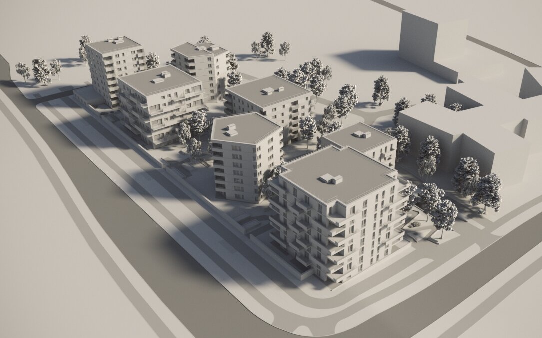 Der städtebauliche Gesamtentwurf, der im Jahr 2016 im Rahmen eines Realisierungswettbewerbs den ersten Preis erhielt, entwickelt mit seinen sieben solitären Wohnkörpern eine eigenständige bauliche Figur. Durch ihren integrativen, aber zugleich auch eigenständigen Charakter tritt sie mit ihrer engen Verzahnung von Stadt- und Grünstrukturen als Naht-Stelle zwischen den städtischen Außenräumen in Erscheinung.