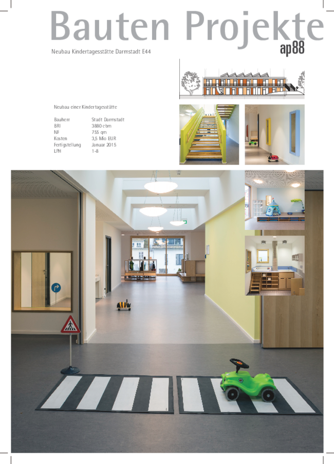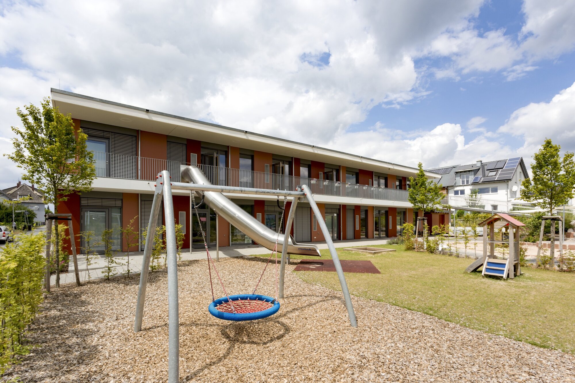 Im EG ist die Betreuung der unter 3-jährigen mit den dazugehörigen Räumen vorgesehen, im OG die der über 3-jährigen. Die Küche im EG und der Mehrzweckraum im OG dienen beiden Bereichen; die Einheit aus Mehrzweckraum und Küche ist auch außerhalb der Öffnungszeiten der Kindertagesstätte nutzbar.