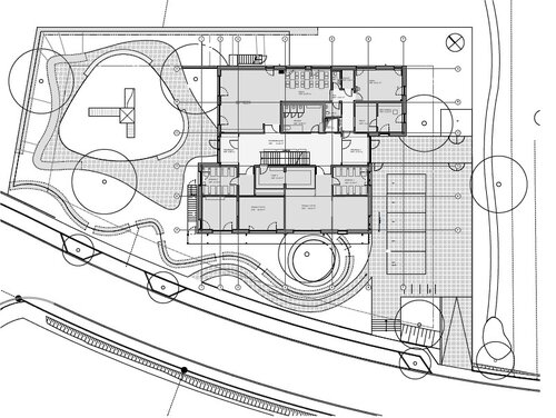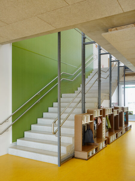 Die Gestaltung der Fassade nimmt die Farben der Umgebung auf. Das Maigrün und Gelb der Wiese mit ihren Obstbäumen und das Smaragdgrün der vereinzelten Nadelbäume finden sich in den versetzt auf der Fassade angeordneten Raffstore-Kästen wieder. Die Behänge ergänzen das Farbspiel durch sonnige Gelbtöne, die sich im Gebäudeinneren im Bodenbelag wiederfinden und so das Farbkonzept im Innenraum und mit dem der Fassade verbinden. Je nachdem ob und wie viele der Behänge herunter gelassen sind, entsteht ein variierendes Farbspiel auf den Außenwänden. Die neutrale Putzfassade bildet die Leinwand für dieses Farbspiel.