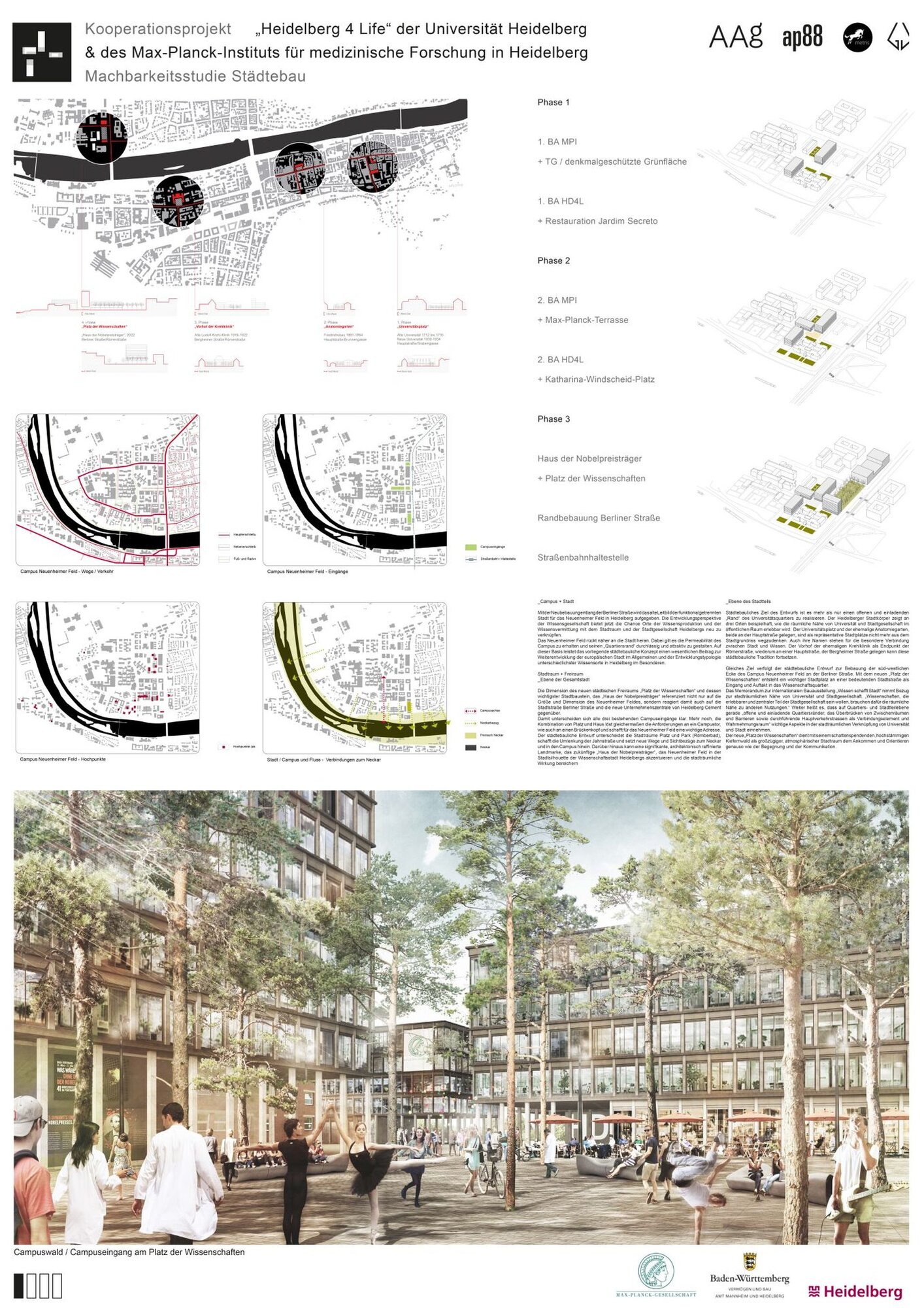 Das Neuenheimer Feld rückt näher an die Stadt heran. Dabei gilt es die Permeabilität des Campus zu erhalten und seinen „Quartiersrand“ durchlässig und attraktiv zu gestalten. Auf dieser Basis leistet das vorliegende städtebauliche Konzept einen wesentlichen Beitrag zur Weiterentwicklung der europäischen Stadt im Allgemeinen und der Entwicklungstypologie unterschiedlichster Wissensorte in Heidelberg im Besonderen.