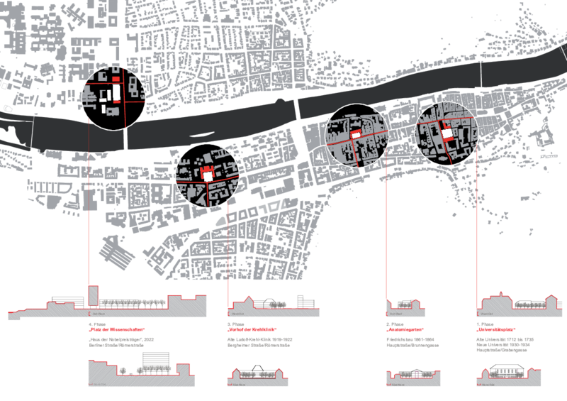 Der Universitätsplatz und der ehemalige Anatomiegarten, beide an der Hauptstraße gelegen, sind als 2 repräsentative Stadtplätze nicht mehr aus dem Stadtgrundriss wegzudenken. Auch ihre Namen stehen für die besondere Verbindung zwischen Stadt und Wissen. Der Vorhof der ehemaligen Krehlklinik als Endpunkt der Römerstraße, wiederum an einer Hauptstraße, der Bergheimer Straße gelegen kann diese städtebauliche Tradition fortsetzen.