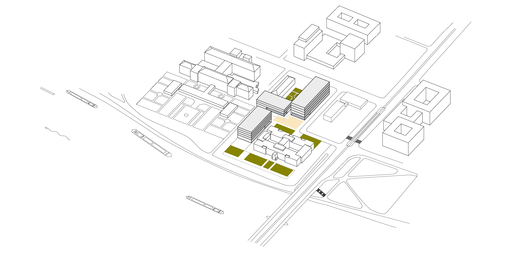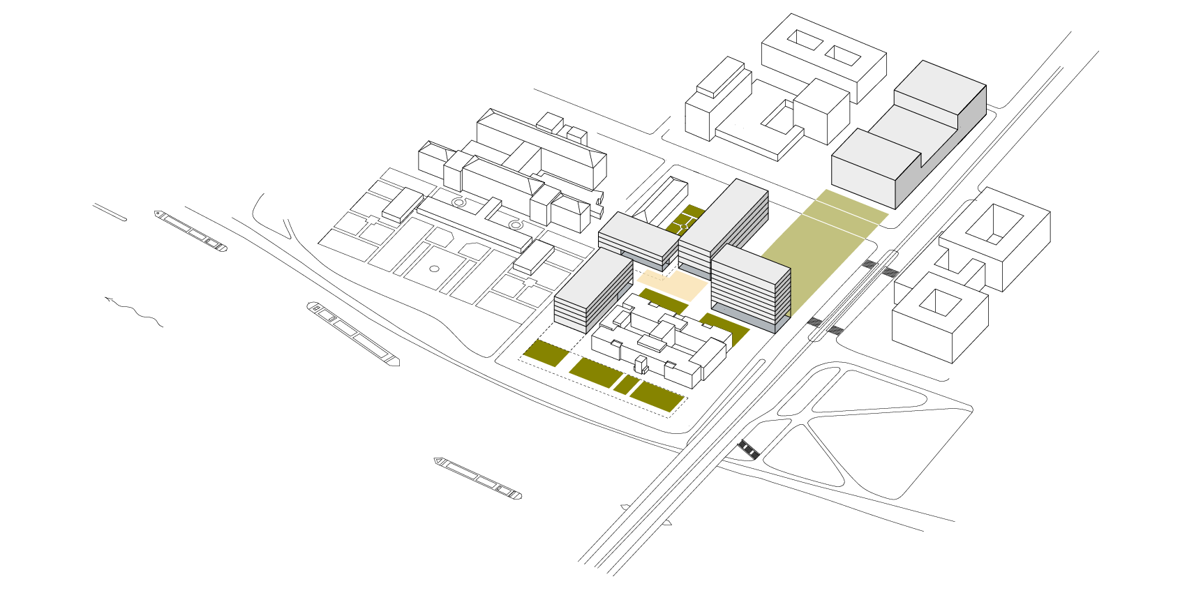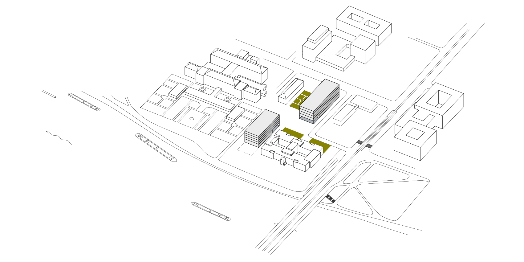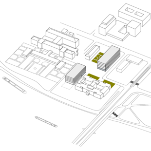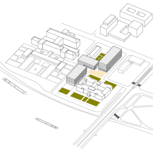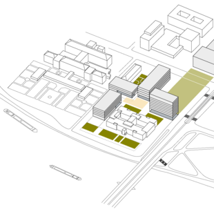 Gleiches Ziel verfolgt der städtebauliche Entwurf zur Bebauung der süd-westlichen Ecke des Campus Neuenheimer Feld an der Berliner Straße. Mit dem neuen „Platz der Wissenschaften“ entsteht ein wichtiger Stadtplatz an einer bedeutenden Stadtstraße als Eingang und Auftakt in dasWissenschaftsquartier.