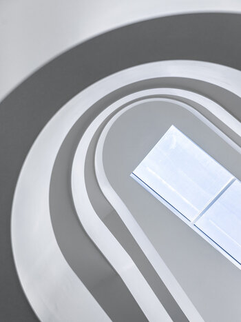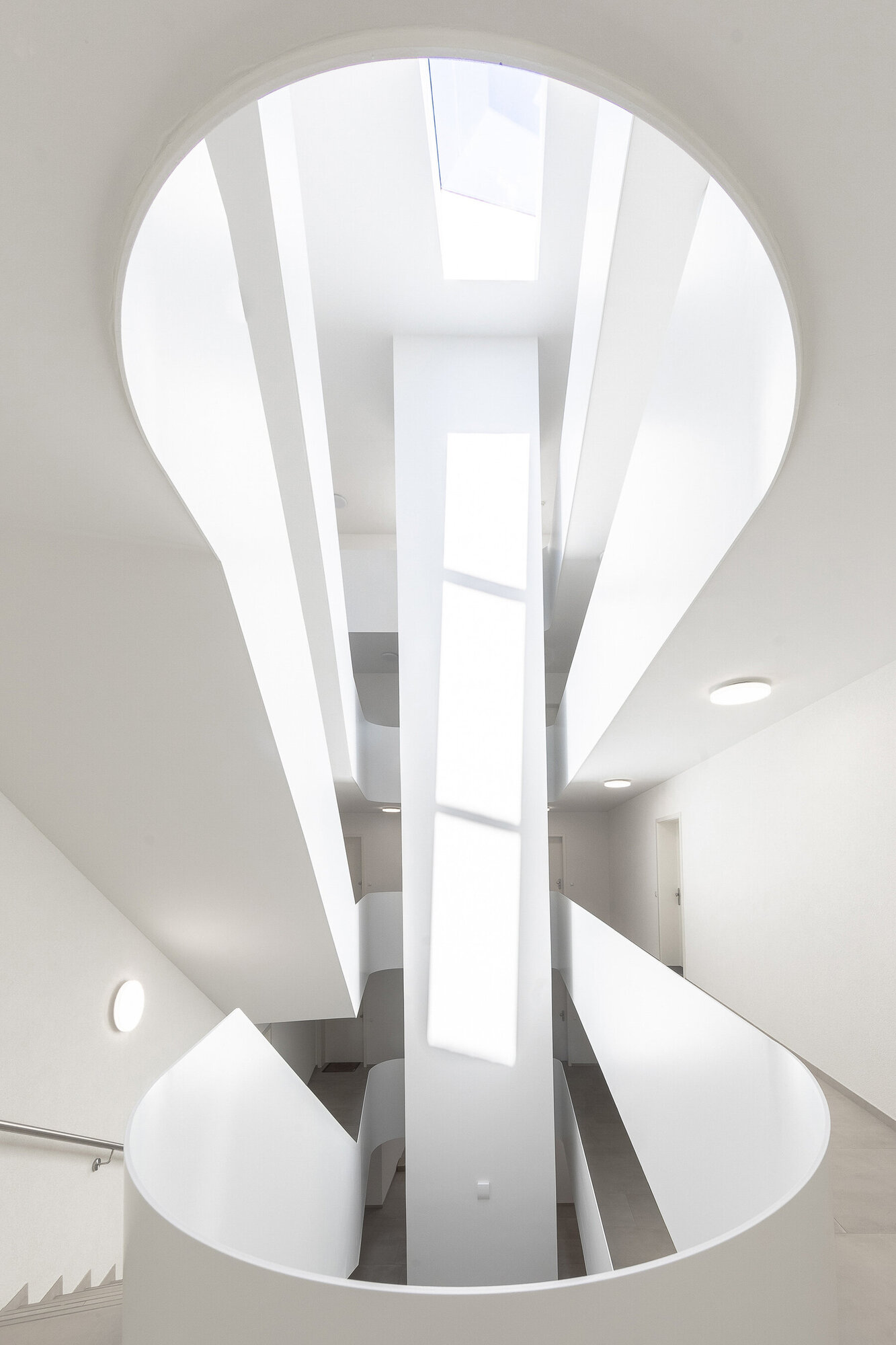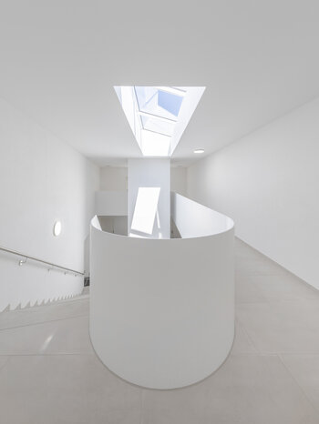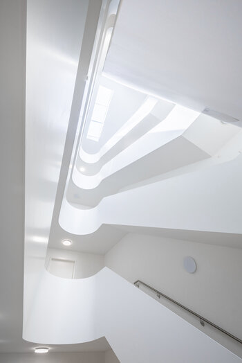 Für uns ist das Treppenhaus hier mehr als nur Erschließung. Es ist ein zusätzliches räumliches Angebot, nachbarschaftliche Kontakte zu fördern. Deshalb haben wir hier besondere gestalterische Sorgfalt walten lassen. Das über ein großzügiges Glasoberlicht gewonnene Tageslicht wird über die hell beschichteten Umwehrungsflächen der Treppen und Podeste bis ins Erdgeschoss reflektiert. Sitzgelegenheiten und Pflanzen schaffen eine angenehme Atmosphäre für den sprichwörtlichen Plausch auf dem Treppenabsatz.