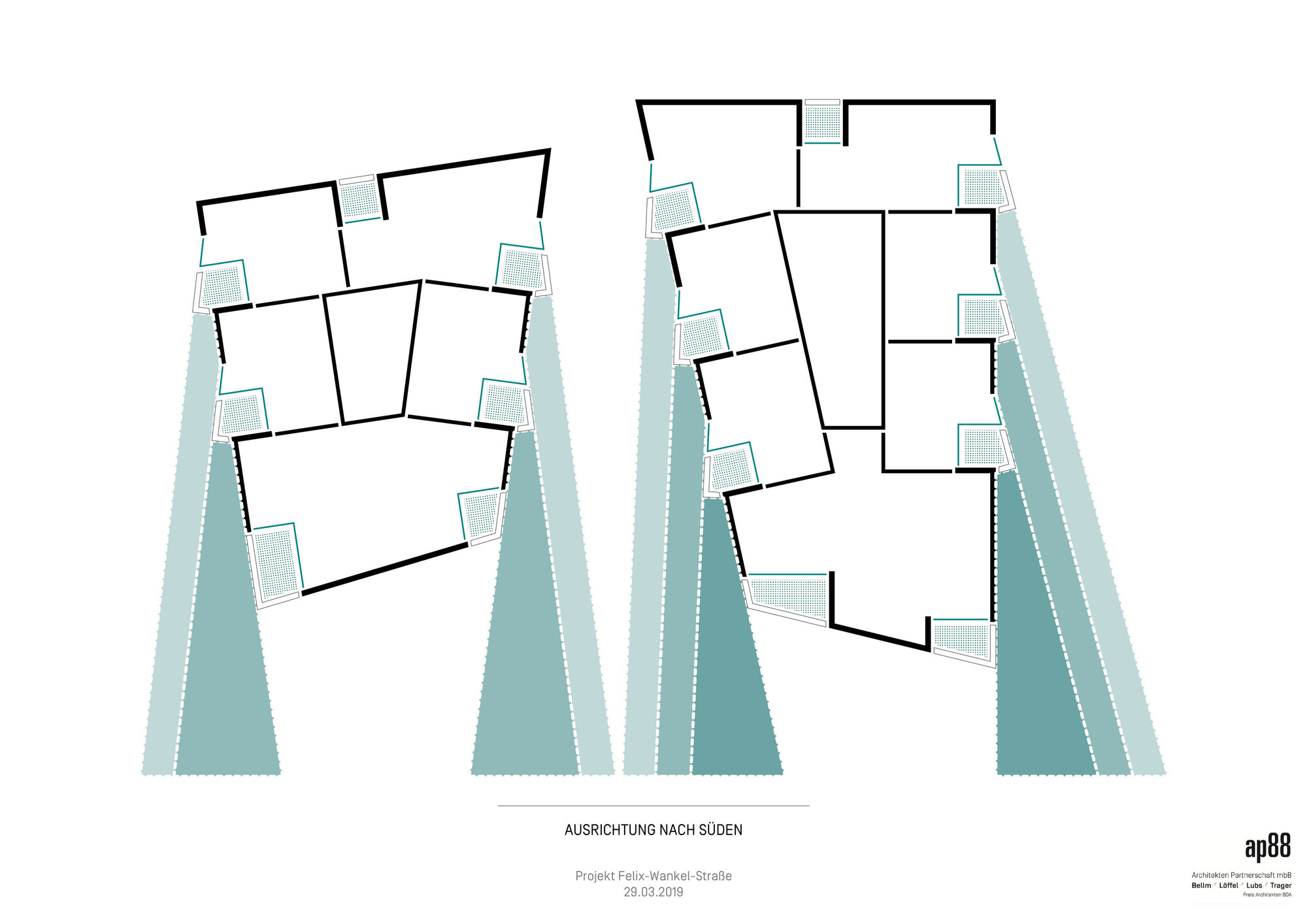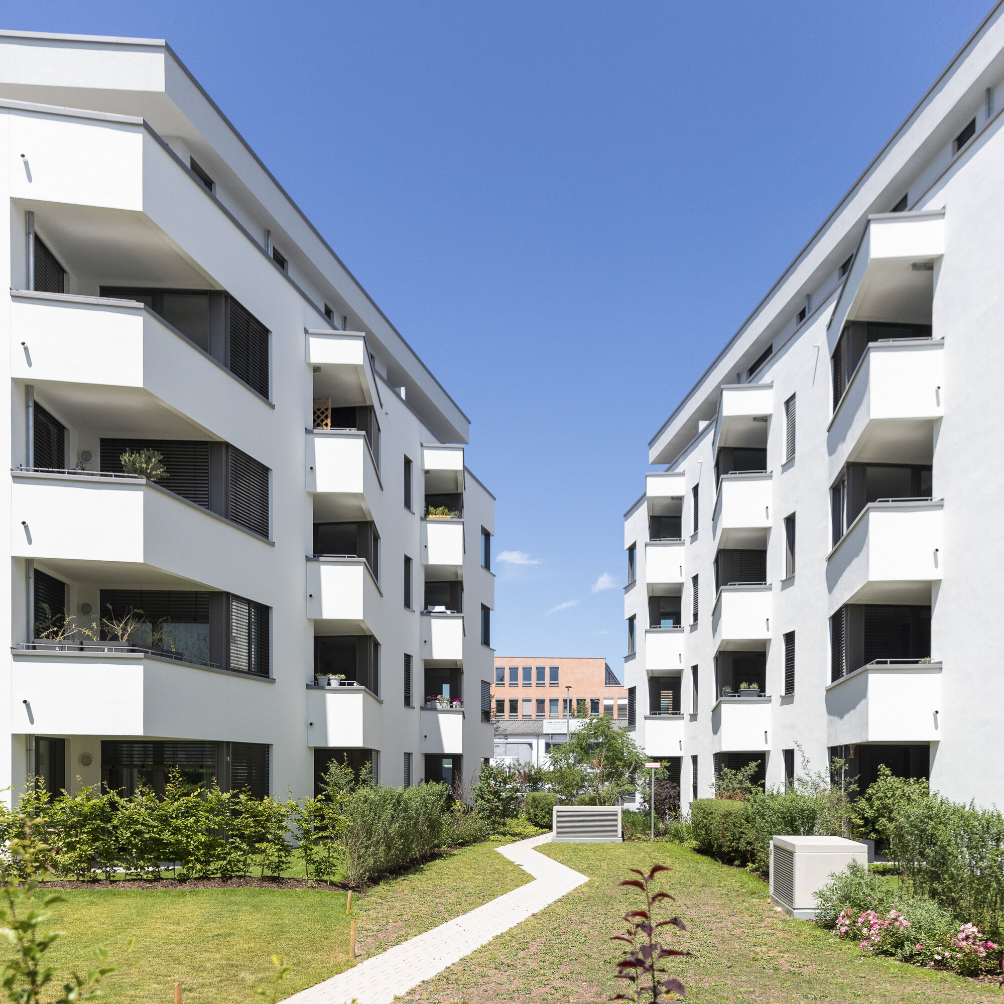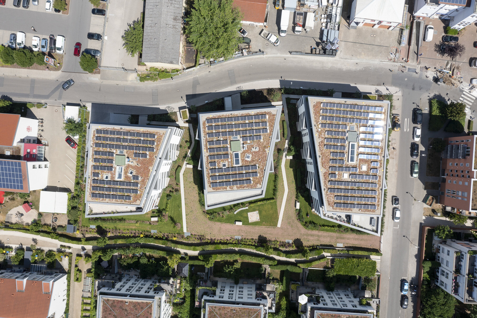 Die im Grundriss trapezförmigen Gebäude orientieren sich mit ihrem breiten Rücken zur Felix-Wankel-Straße und formen Richtung Süden einen Trichter, der Sonne und Grün einfängt.
