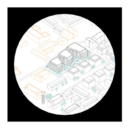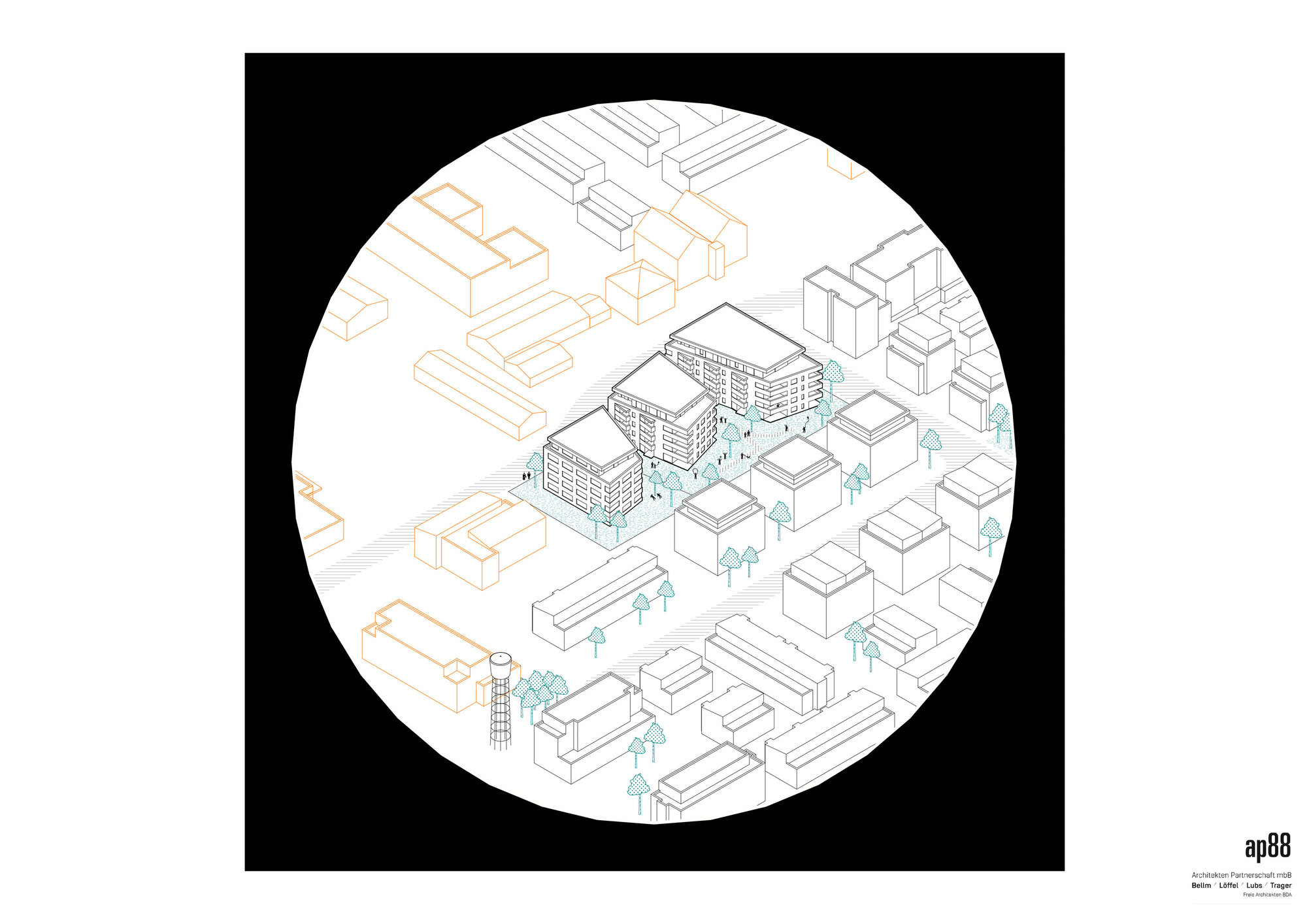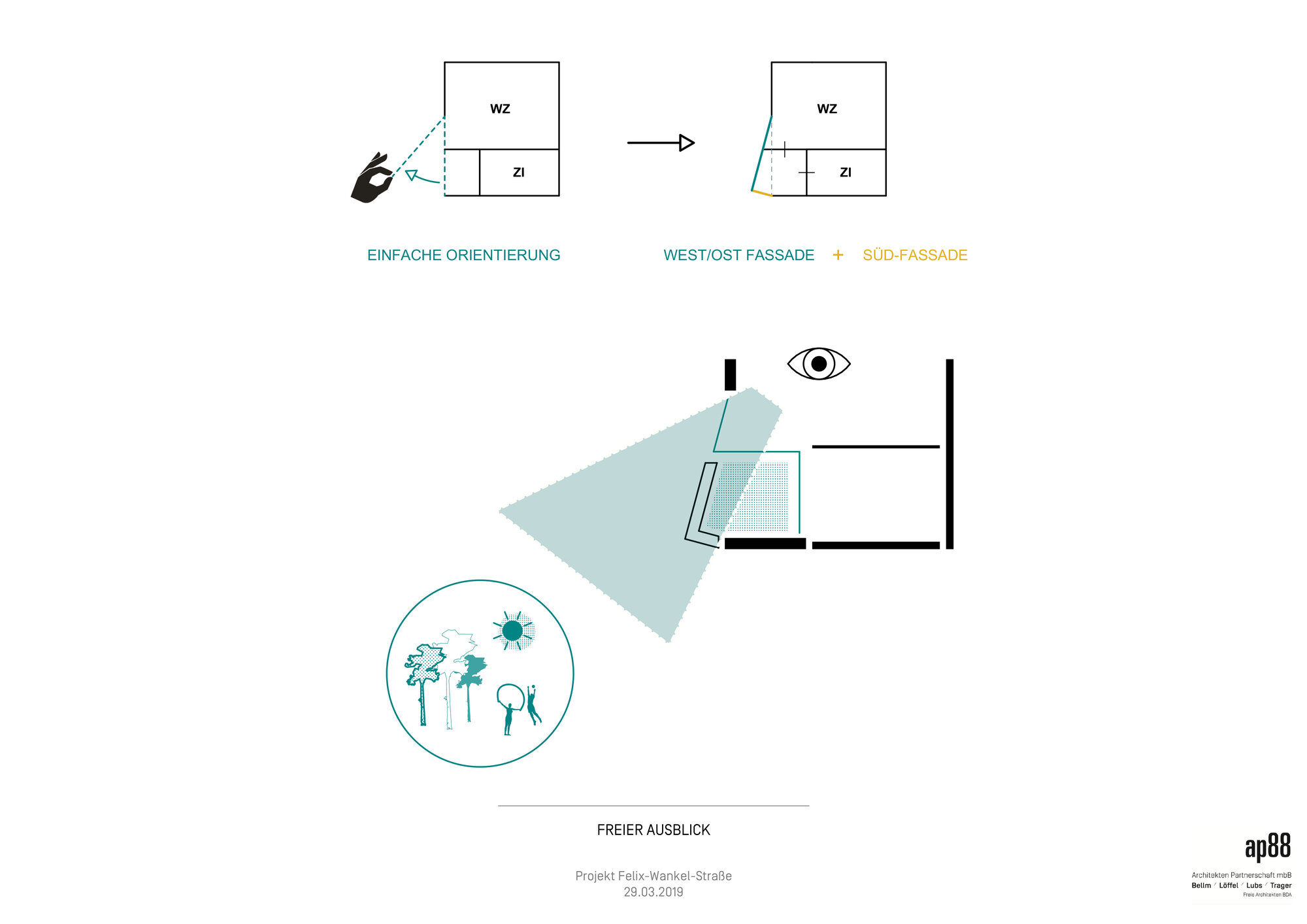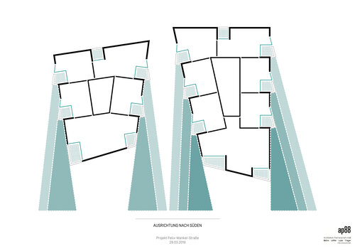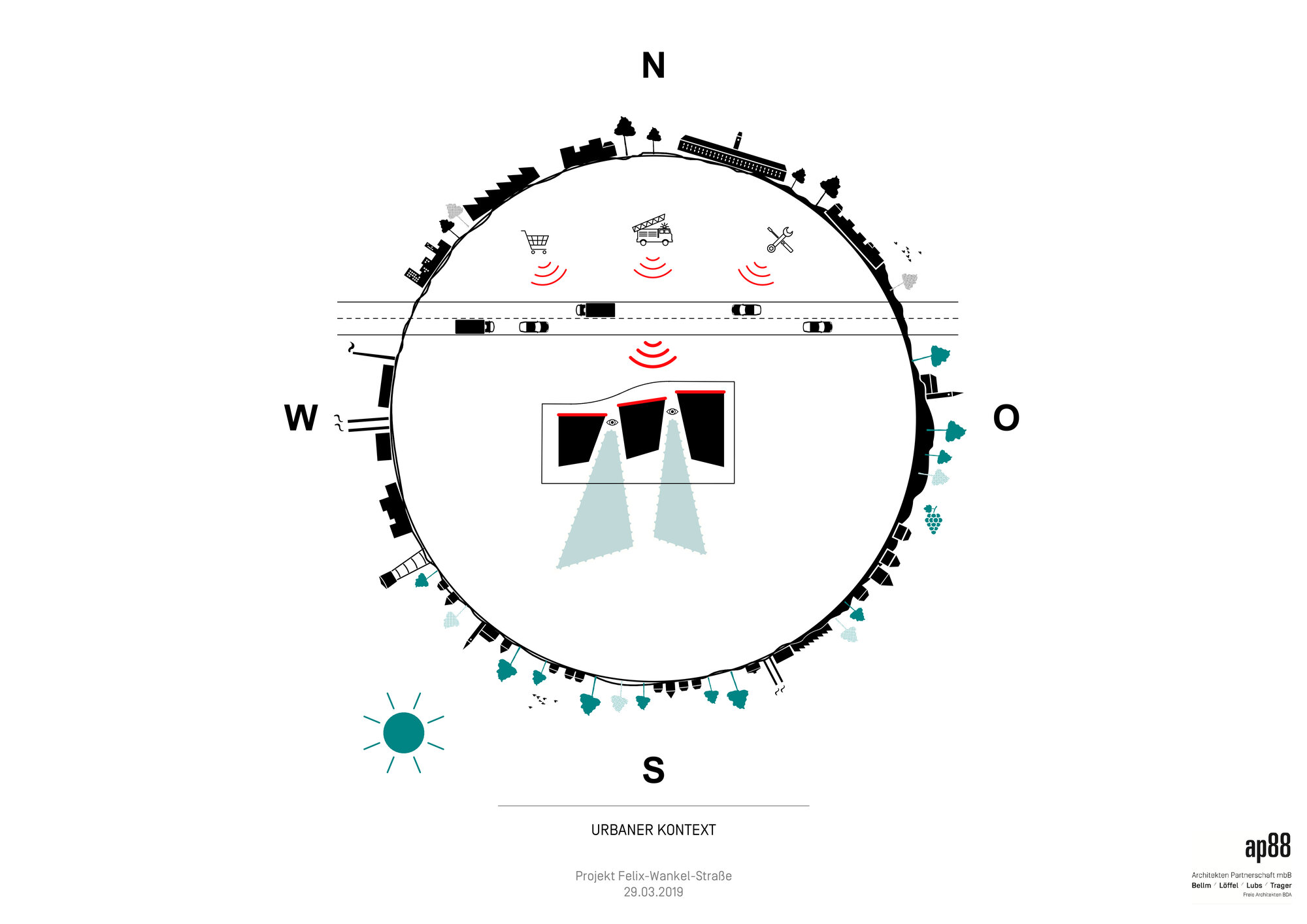 Das Grundstück hat eigentlich 2 Seiten unterschiedlicher Qualität. Im Norden gibt es ein Gewerbegebiet und die Felix-Wankelstraße. Im Süden ist das durchgrünte Quartier am Turm. Diesem Umstand galt es Rechnung zu tragen.