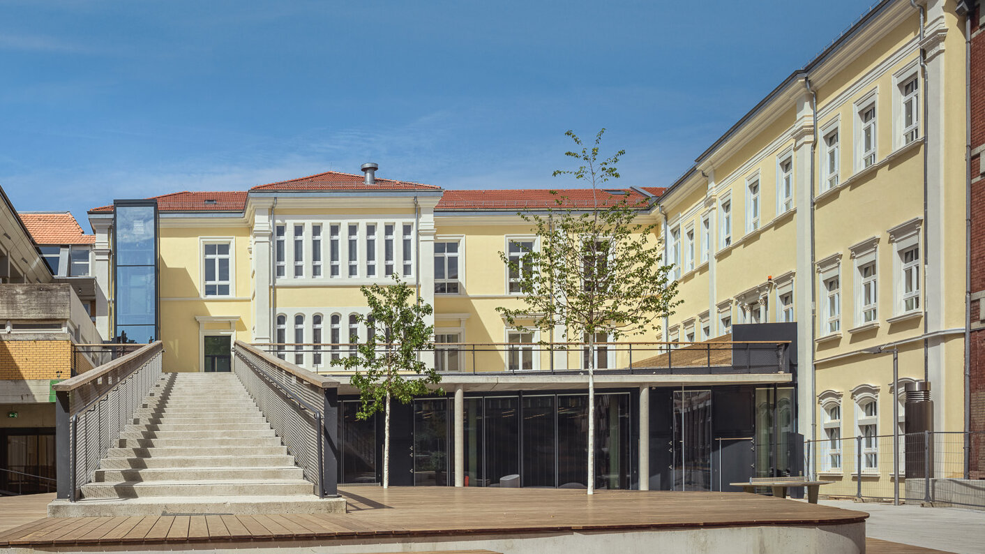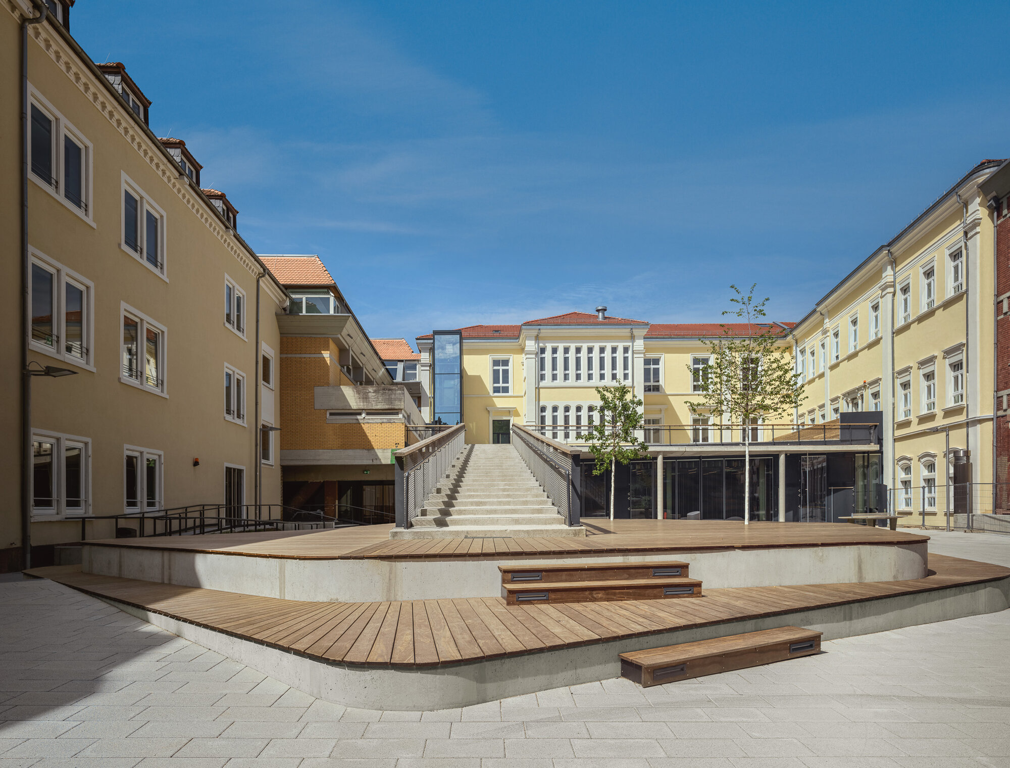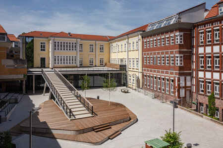 Der Schulhof wird künftig aus zwei Ebenen bestehen: dem als Pausenfläche nutzbaren Dach des Anbaus für die Theaterpädagogik und dem unteren Schulhof. So konnte die Größe des Schulhofs trotz des Erweiterungsbaus unverändert bleiben. Verbunden sind beide Bereiche mit einer großzügigen Treppe, die die Möglichkeit zum Sehen und Gesehen werden bietet. Sie endet in einem großzügigen Holz-Sitzpodest, in dem auch zwei Bäume vorgesehen sind.