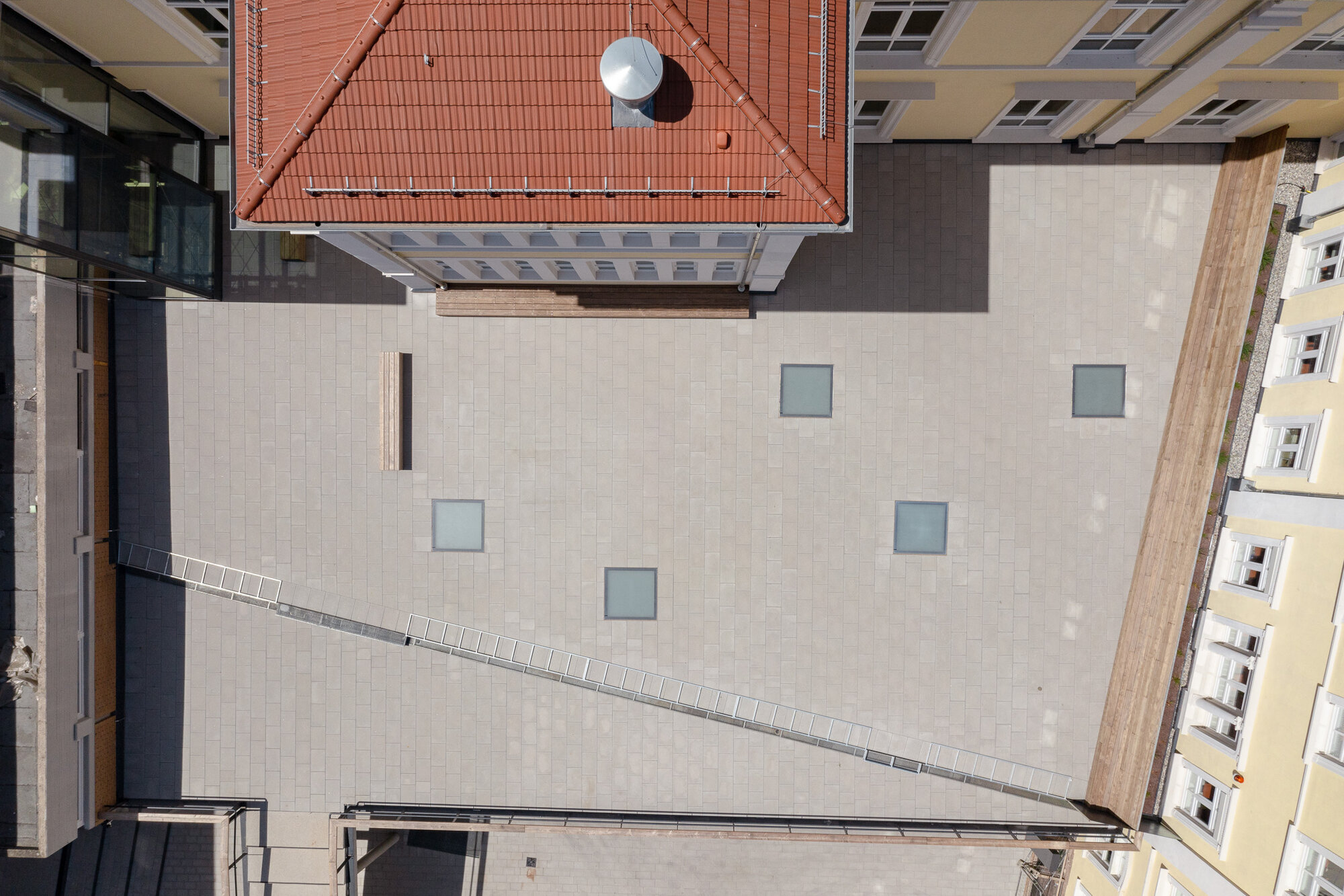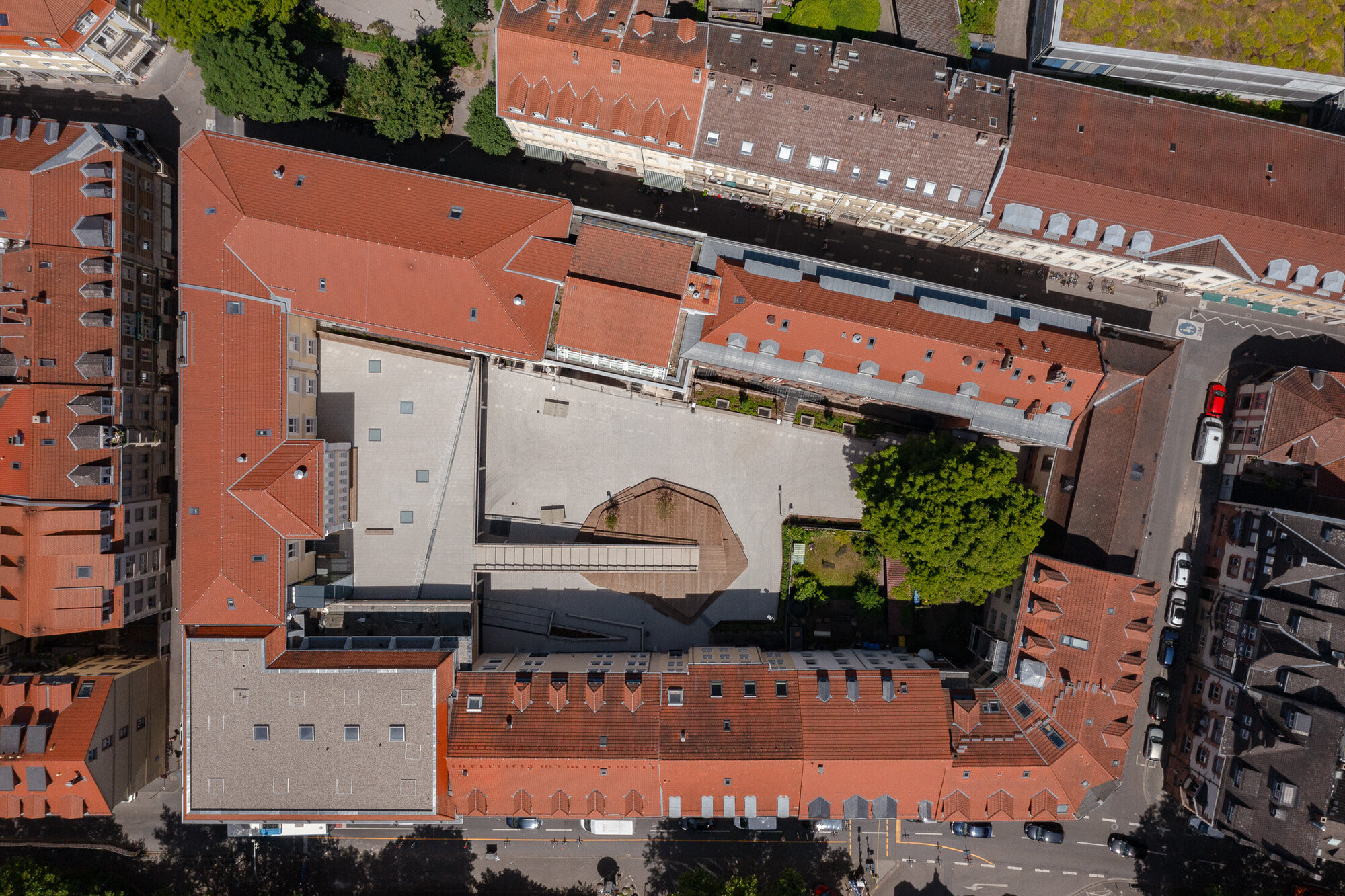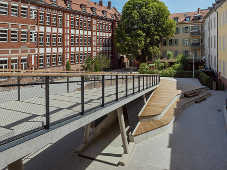 Die Zufahrt in die Tiefgarage wurde bereits im ersten Bauabschnitt vom Schulhof in die Friedrich-Ebert-Anlage verlegt. So konnte der gefährliche Autoverkehr aus dem Hof verlagert werden. Durch die alte Abfahrtsrampe im Schulhof wird künftig die neue Fahrradtiefgarage erschlossen. Nasse Fahrradsattel sind damit künftig kein Thema mehr.