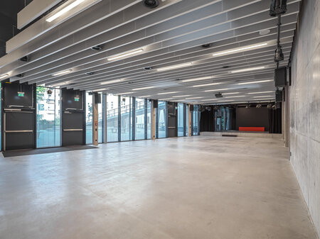 Der sich im nördlichen Bereich des Schulhofes an den Bestand schmiegende Theaterraum vereint Foyer, Zuschauerraum, Bühne, Nebenflächen, Sporthallenfoyer, Müllraum etc. unter einem gemeinsamen, die räumliche Situation ordnenden Dach.
