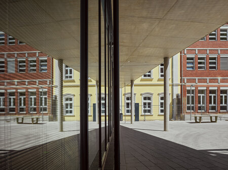 Die Glasfassade, die sich dem Ankommenden zuwendet, inszeniert im Zusammenspiel mit dem spitzwinkelig zulaufenden Vordach das Entree in den Schulhof.