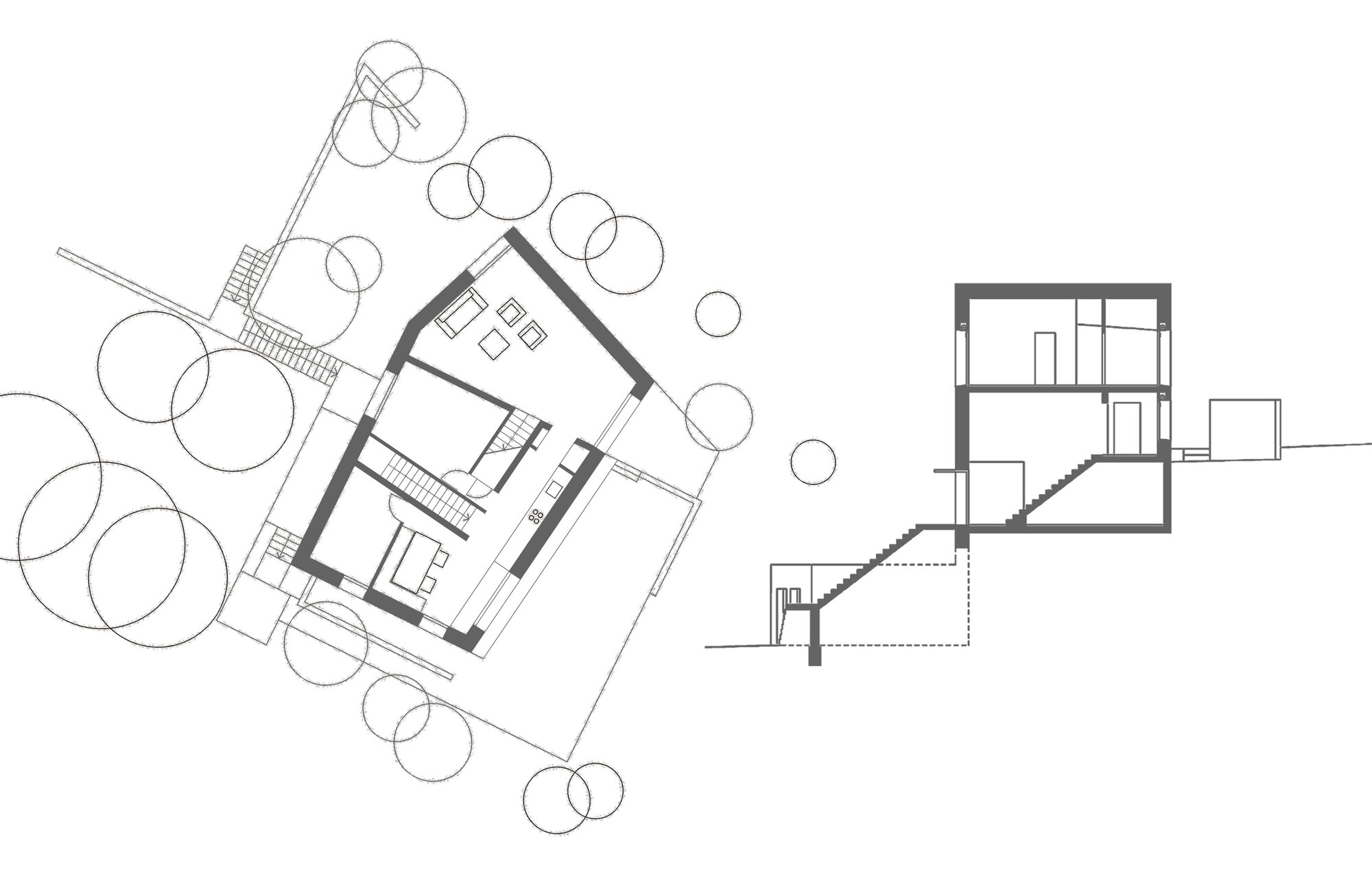 Der Grundriss organisiert sich ähnlich einer Perlenkette. Die Räume sind mäandrierend aneinandergereiht. Den klassischen Flur mit sternförmig abgehenden Zimmern und zentralem Treppenhaus gibt es nicht. Das Haus will erschlossen werden. Jeder Raum hat seine eigene Charakteristik sowohl im Grundriss als auch im Schnitt.