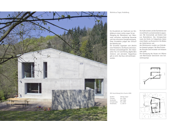 Ein Grundstück am Stadtrand von Heidelberg in einem steilen engen Tal am Übergang der Rheinebene zum Odenwald, einfachste nachhaltige Bauweise und eine alternative Energieversorgung. Diese Grundsätze prägen den Entwurf des Wohnhauses.
